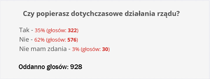 Zapytaliśmy Czytelników info.elblag.pl, czy popierają dotychczasowe działania rządu. Ankieta trwała od 8 do 12 grudnia. W sumie oddano 928 głosów.
