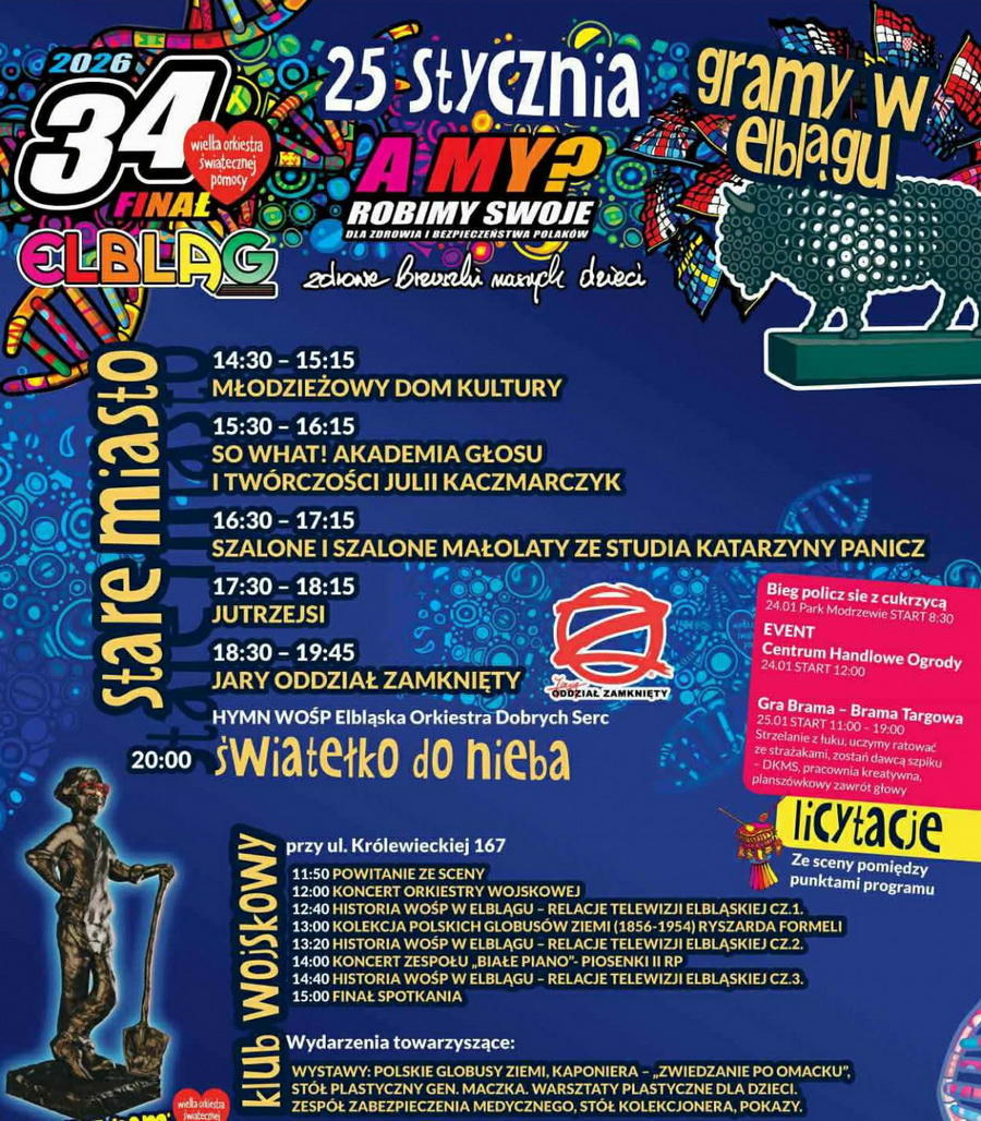 W Klubie Wojskowym przy ul. Królewieckiej 167 też będzie się dużo dziać. O godz. 12:00 Orkiestra Wojskowa da 40- minutowy koncert, po którym zostanie pokazana historia WOŚP w Elblągu (kolejna część zostanie pokazana o godz. 13.20 i 14.40).