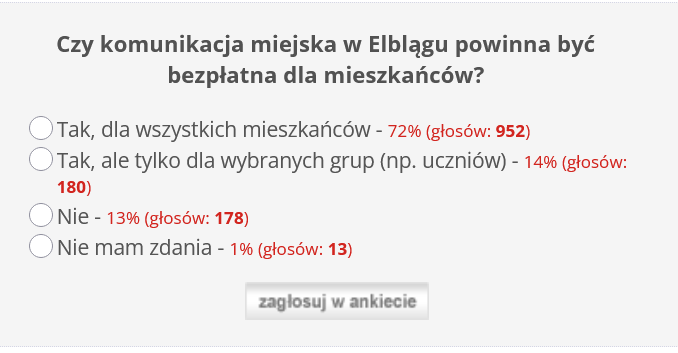 Zdecydowana większość internautów (72 proc., 952 głosy) uważa, że komunikacja miejska w Elblągu powinna być darmowa dla wszystkich mieszkańców. Tylko 14 proc. (180 głosów) twierdzi, że z takiej ulgi powinny korzystać jedynie wybrane grupy, np. uczniowie.
