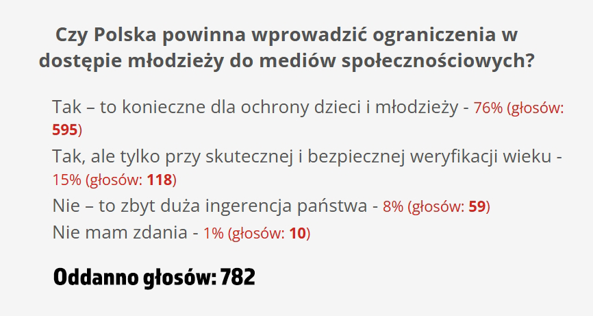 Zdecydowana większość, bo 76 proc. (595 głosów) internautów, opowiedziała się za tym, aby w naszym kraju wprowadzono takie ograniczenie dla młodych ludzi, dla ich ochrony 15 proc. (118 głosów) jest za przyjęciem takiego rozwiązania, ale tylko przy skutecznej i bezpiecznej weryfikacji wieku. Na "nie", przekonując, że to zbyt duża ingerencja państwa, zagłosowało 8 proc. (59 głosów), natomiast 1 proc. (10 głosów) nie ma zdania.