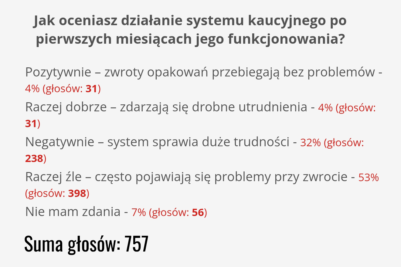 Ponad połowa internautów (53 proc., 399 głosów) ocenia system kaucyjny raczej źle, wskazując na problemy, które często pojawiają się przy zwrocie opakowań. Natomiast 32 proc. (240 głosów) ocenia go zdecydowanie negatywnie — ich zdaniem system sprawia duże trudności.