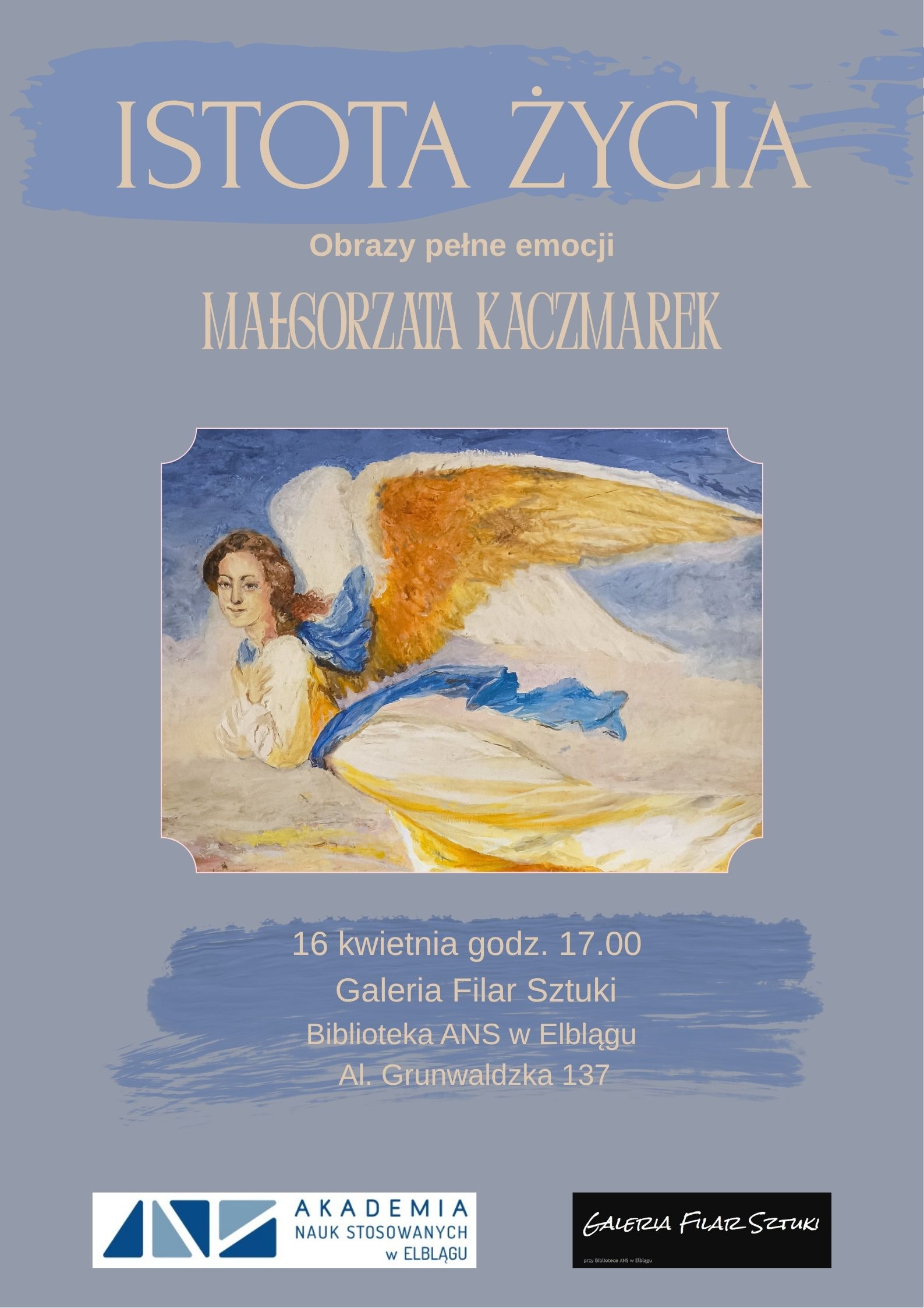 Biblioteka Akademii Nauk Stosowanych w Elblągu serdecznie zaprasza na wystawę malarstwa Małgorzaty Kaczmarek "Istota życia" w Galerii Filar Sztuki przy Bibliotece ANS w Elblągu (Al. Grunwaldzka 137), której otwarcie odbędzie się 16 kwietnia o godz.17:00.