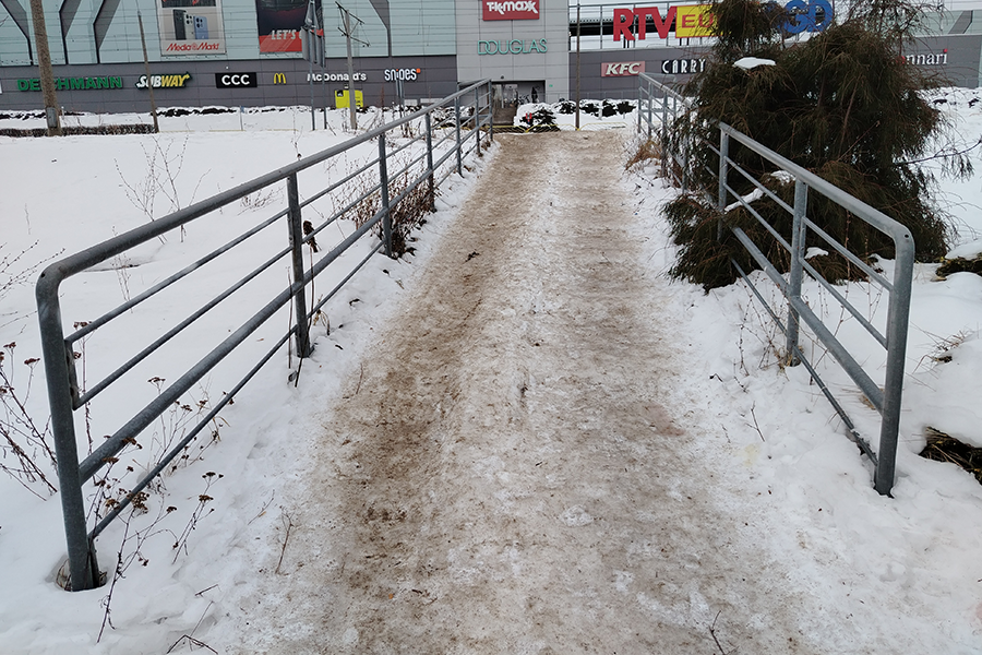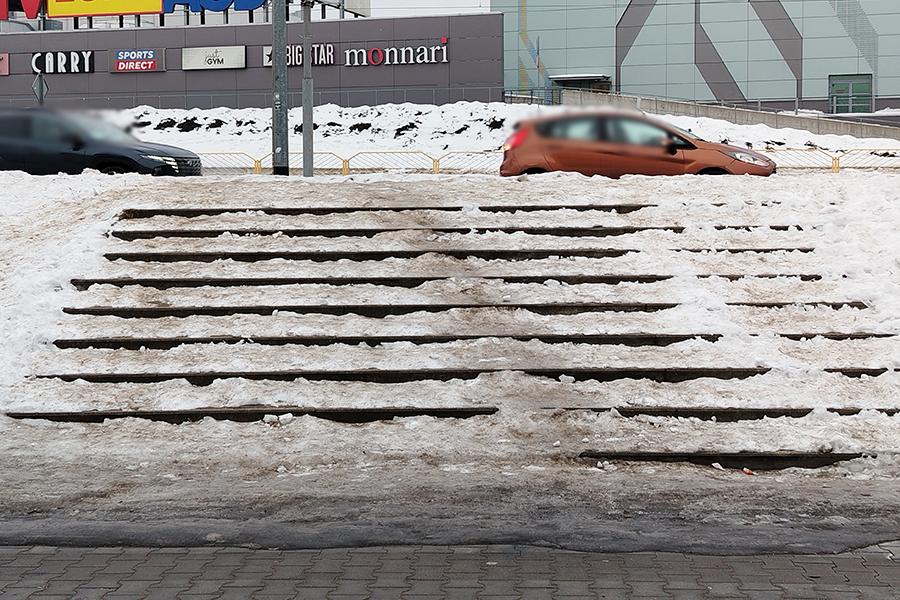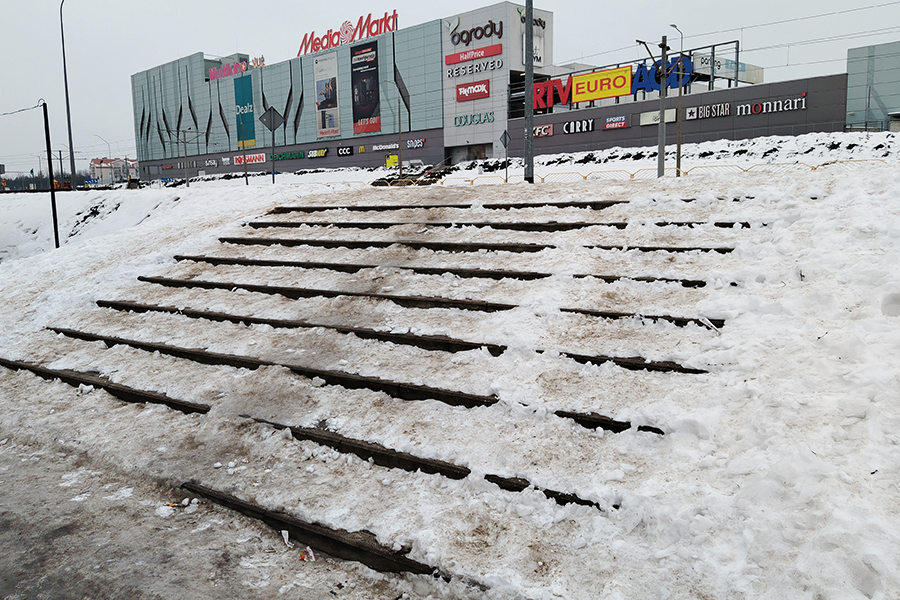 Naprzeciwko Centrum Handlowego Ogrody jest Biedronka. Dostanie się do niej jest wyzwaniem od kiedy spadł śnieg. Rozumiem, że od razu śnieg nie jest usuwany, ale tych schodów już prawie nie widać. Dlaczego osoby za to odpowiedzialne się tym nie zajmują?