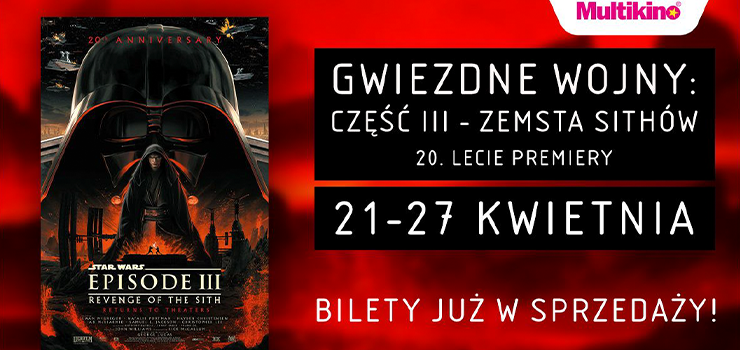 Po 20 latach ostatni rozdział słynnej sagi George'a Lucasa powróci na wielkie kinowe ekrany. Multikino już uruchomiło przedsprzedaż biletów na pokazy filmu „Gwiezdne wojny: Część III - Zemsta Sithów. 20-lecie” od 21 do 27 kwietnia. Szczegółowy repertuar jest dostępny na stronie www.multikino.pl.