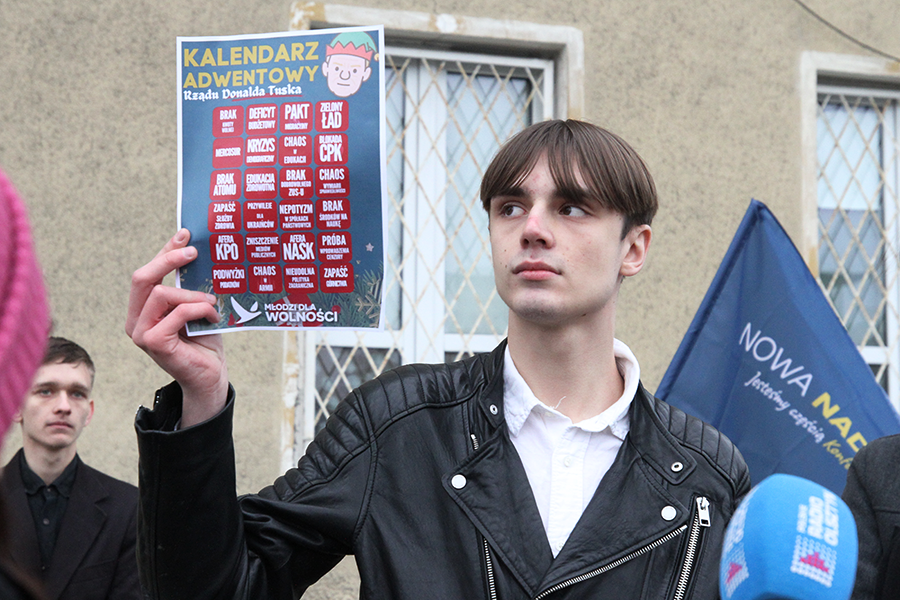 Działacze Młodych dla Wolności, młodzieżówki ugrupowania Nowa Nadzieja Sławomira Mentzena, pojawili się dziś (12 grudnia) przed biurem senatora Jerzego Wcisły i Elżbiety Gelert w Elblągu z symboliczną rózgą i specjalnym kalendarzem adwentowym „porażek rządu Donalda Tuska”. W ten sposób podsumowali dwa lata rządów koalicji 15 października. Ich ocena jest zdecydowanie krytyczna.