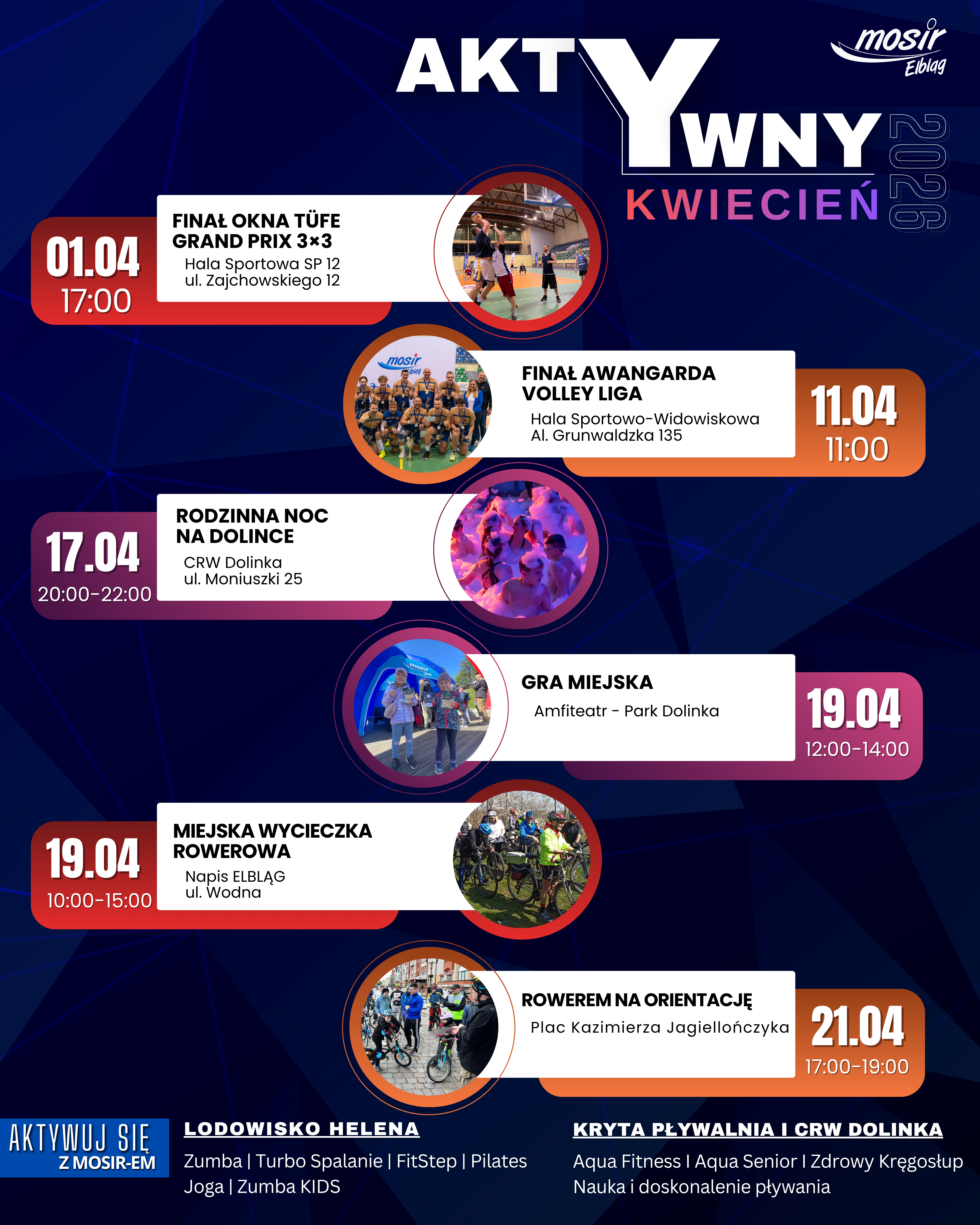 Kwiecień w Elblągu zapowiada się aktywnie i różnorodnie – od sportowej rywalizacji w halach, przez rodzinne wydarzenia w wodzie, aż po rowerowe i terenowe wyzwania na świeżym powietrzu. Sprawdźcie, co przygotowaliśmy na najbliższe tygodnie i zaplanujcie swój czas z MOSiR-em.