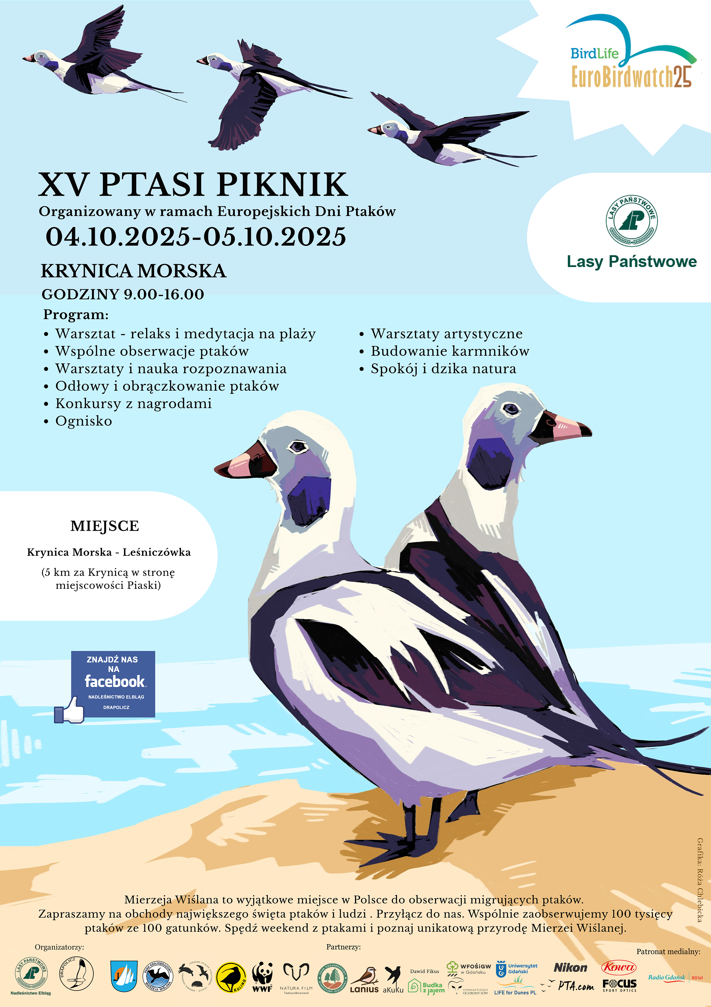 Zapraszamy od godziny 9 do 16 ( w sobotę i niedzielę) do wspólnego obserwowania migrujących nad naszymi głowami ptaków. Przy dawnej leśniczówce Krynica Morska w połowie drogi pomiędzy Krynicą Morską, a Piaskami. Pod okiem ornitologów i leśników policzymy przelatujące ptaki.