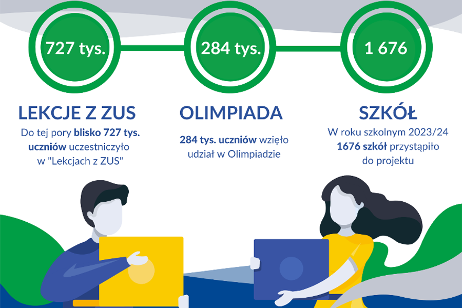 Zakład Ubezpieczeń Społecznych już od 2013 r. gości w szkołach z projektem edukacyjnym „Lekcje z ZUS”. Dotychczas wzięło w nim udział niemal 730 tys. uczniów szkół ponadpodstawowych z całej Polski. Zwieńczeniem projektu jest olimpiada „Warto wiedzieć więcej o ubezpieczeniach społecznych”.