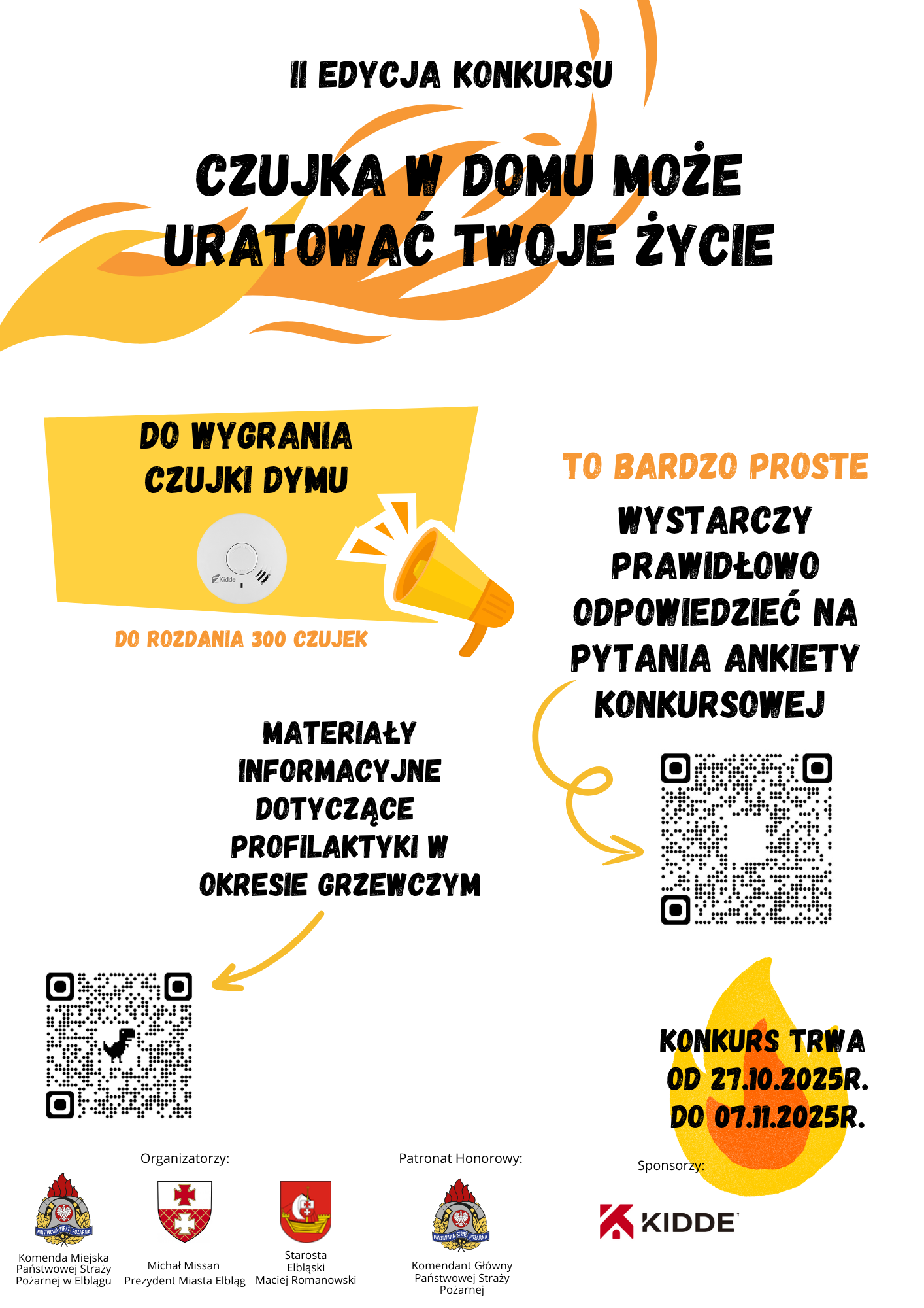 Wraz z rozpoczęciem sezonu grzewczego Prezydent Elbląga Michał Missan, Starosta Elbląski Maciej Romanowski oraz mł. bryg. Bogdan Grzymowicz Komendant Miejski Państwowej Straży Pożarnej w Elblągu zachęcają mieszkanki i mieszkańców Elbląga do udziału w II edycji konkursu „Czujka w domu może uratować Twoje życie”.