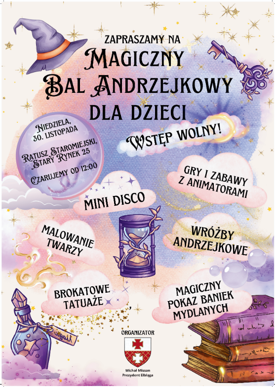 Serdecznie zapraszamy dzieci wraz z rodzicami na Magiczny Bal Andrzejkowy dla Dzieci (przedszkolnych oraz wczesnoszkolnych), który odbędzie się w niedzielę, 30 listopada, w Ratuszu Staromiejskim przy ul. Stary Rynek 25.