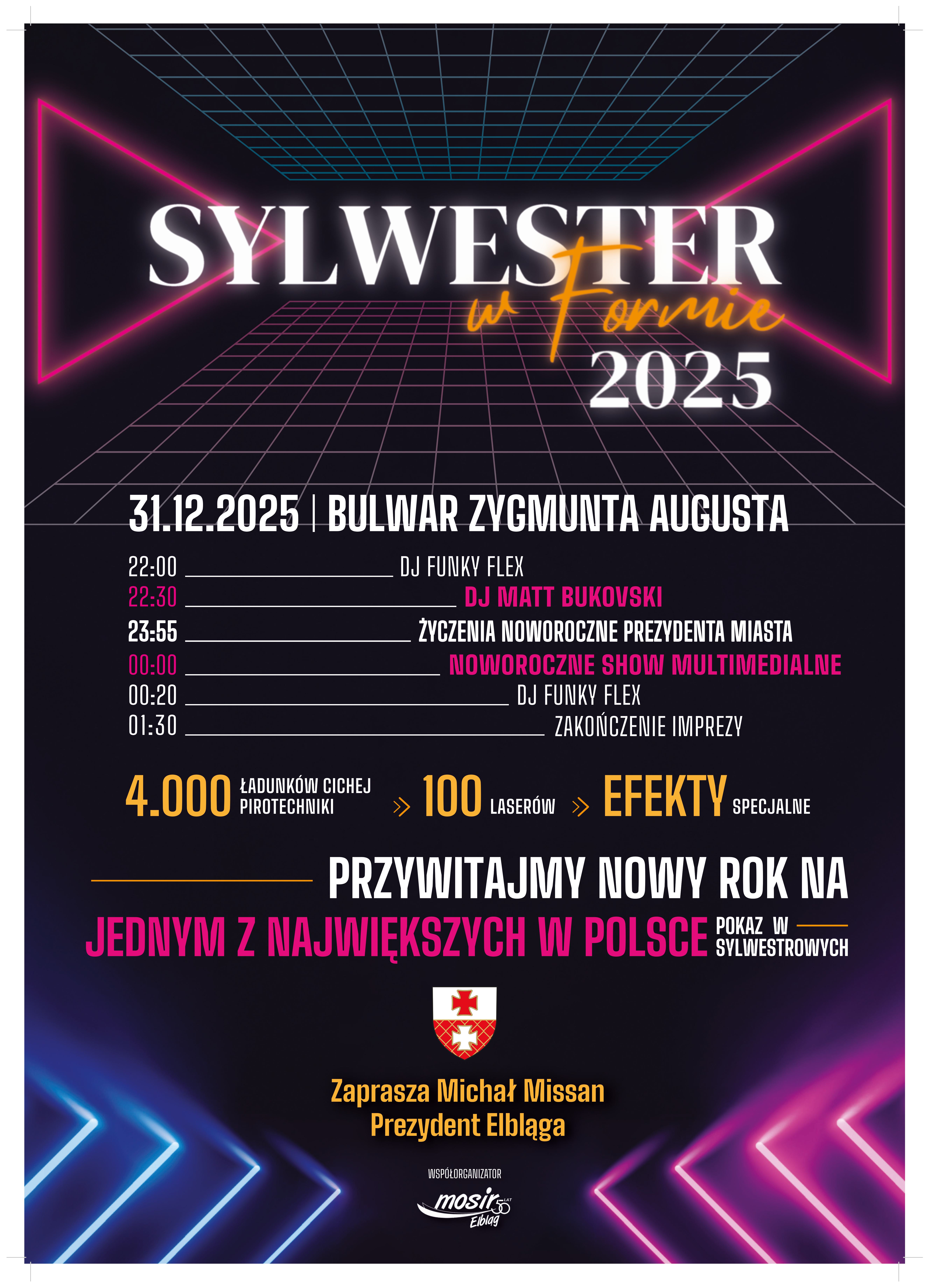 Kulminacyjnym momentem wydarzenia będzie Noworoczne Show Multimedialne o północy, poprzedzone życzeniami noworocznymi Prezydenta Miasta Elbląga Michała Missana. Tegoroczne powitanie Nowego Roku zapowiada się niezwykle efektownie – przygotowano 4 000 ładunków cichej pirotechniki, ponad 100 laserów oraz liczne efekty specjalne, tworząc jedno z największych pokazów sylwestrowych w Polsce.