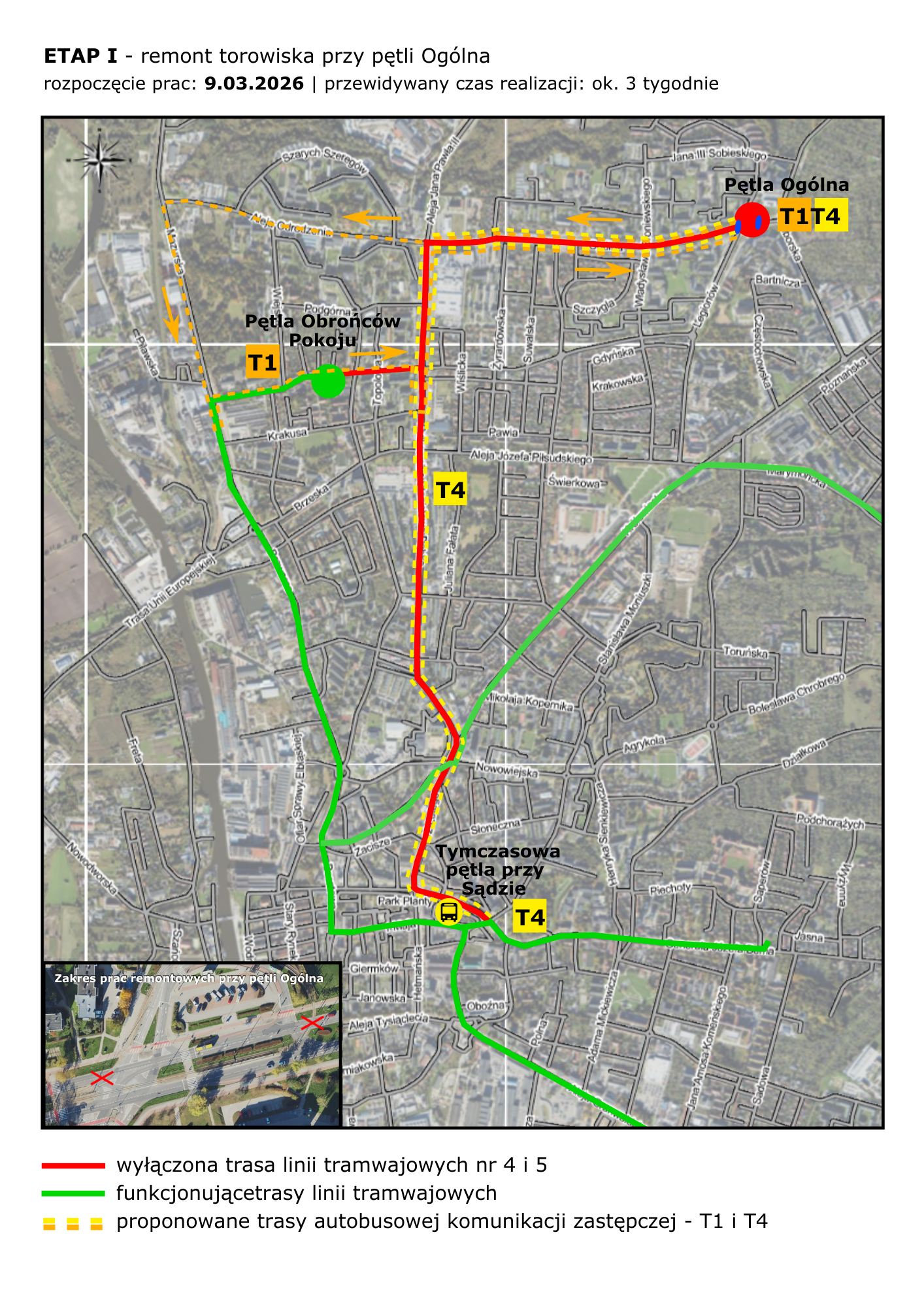 W pierwszej kolejności modernizacji poddane zostaną łuki wjazdowe do pętli tramwajowej przy ul. Ogólnej. Jest to newralgiczny element infrastruktury, a jego przebudowa jest niezbędna dla sprawnego i bezpiecznego funkcjonowania całej sieci. Na czas robót pętla zostanie czasowo wyłączona z użytkowania. W związku z zamknięciem fragmentu północnej jezdni ul. Ogólnej wprowadzona zostanie tymczasowa organizacja ruchu, z wykorzystaniem jezdni południowej oraz tymczasowego, utwardzonego przejazdu na torowisku w rejonie sklepu LIDL. Na czas wyłączenia pętli przy ul. Ogólnej uruchomiona zostanie tymczasowa pętla przy ul. Obrońców Pokoju, do której dojeżdżać będą tramwaje linii nr 1 i 3. Na liniach 1, 2 i 3 zwiększona zostanie liczba brygad. Jednocześnie, na czas prowadzonych prac, zawieszone zostanie kursowanie linii tramwajowych nr 4 i 5. Dla zapewnienia ciągłości komunikacji miejskiej uruchomiona zostanie autobusowa komunikacja zastępcza T4, kursująca na trasie: Ogólna – płk. Dąbka – 12 Lutego – Plac Konstytucji, z możliwością przesiadki na tramwaje w kierunku Dworca lub Placu Słowiańskiego. Dodatkowo wprowadzona zostanie okrężna linia autobusowa T1, kursująca na trasie: Ogólna – Odrodzenia – Mazurska – Browar – Obrońców Pokoju – płk. Dąbka – Ogólna.