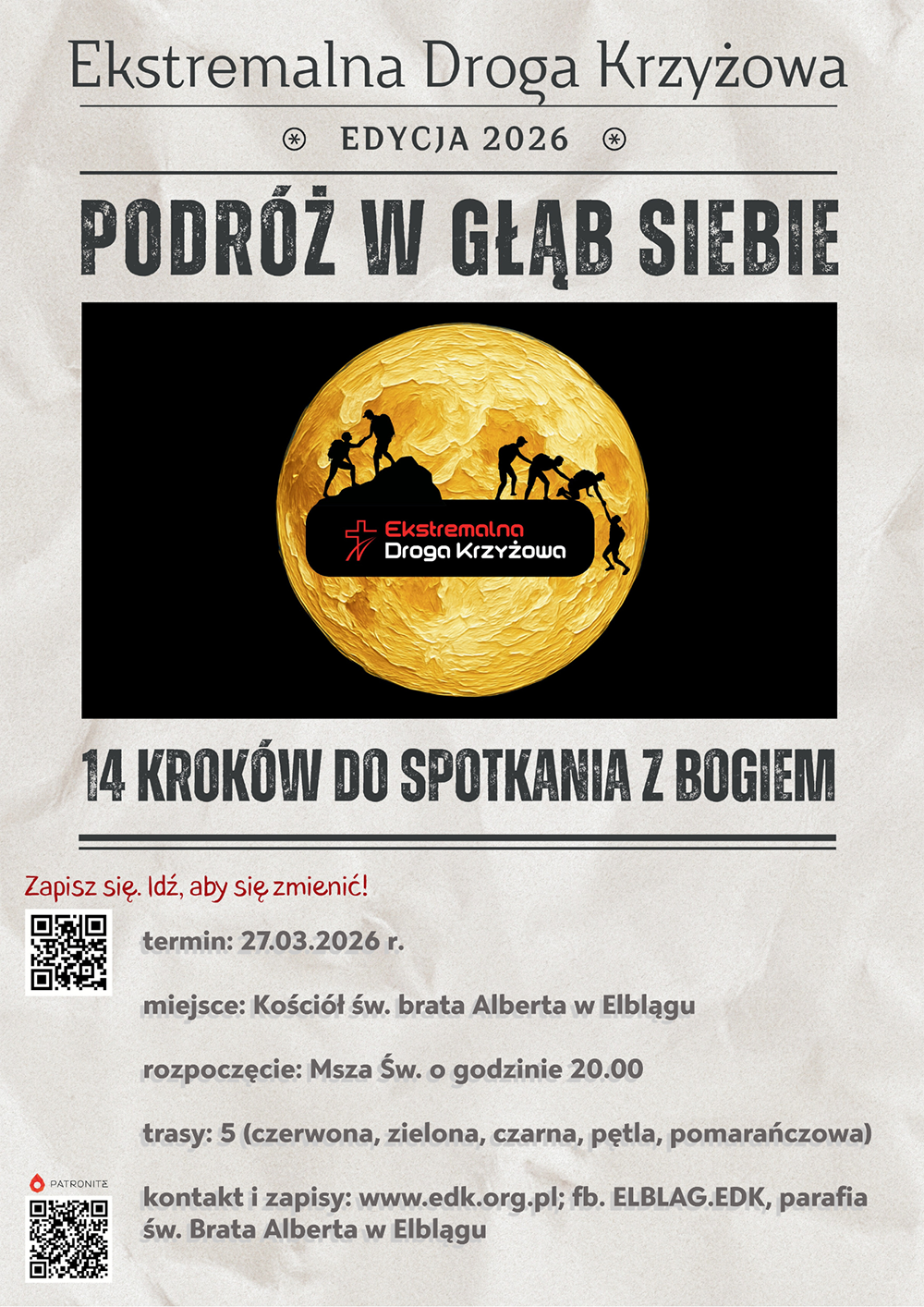 EDK to wędrówka w ciszy, która pozwala na przygotowanie się do lepszego i pełniejszego przeżywania wydarzeń Triduum Paschalnego. EDK to też wędrówka w głąb swojego serca i swojego życia. Od kilku już lat poruszamy różne tematy dotyczące naszego życia. W tym roku 27.03.2026 r. w nocy będziemy podróżować w głąb siebie. Każdego kto chce wyruszyć na EDK zapraszamy do kościoła Św. Brata Alberta przy ul. Częstochowskiej 28 w Elblągu na Mszę św. o godzinie 20.00. Po Mszy św. będzie możliwość odebrania pakietów EDK (koszt 30 zł. – pakiet zawiera: książeczki z rozważaniami, opaskę silikonową i odblaskową oraz opis trasy).