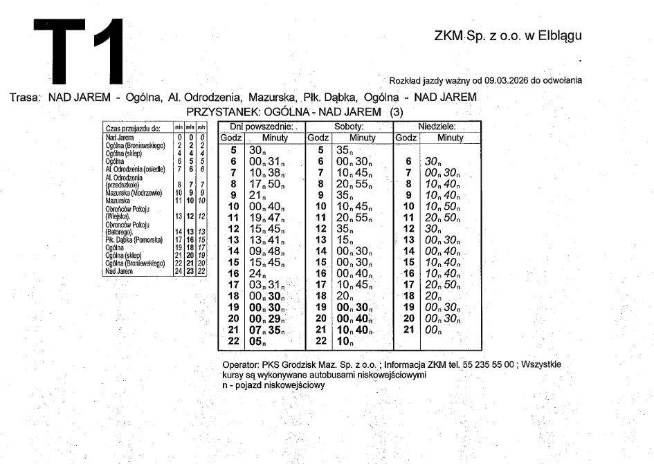 Dodatkowo wprowadzona zostanie okrężna linia autobusowa T1, kursująca na trasie: Ogólna – Odrodzenia – Mazurska – Browar – Obrońców Pokoju – płk. Dąbka – Ogólna. Zobacz mapkę trasy T1: https://www.zkm.elblag.com.pl/wp-content/uploads/2026/03/Linia-T1.pdf