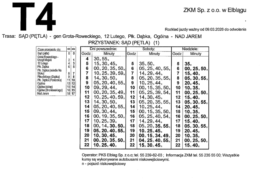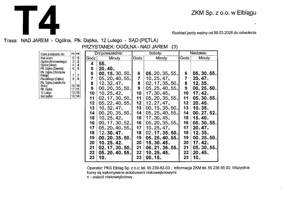 Dla zapewnienia ciągłości komunikacji miejskiej uruchomiona zostanie autobusowa komunikacja zastępcza T4, kursująca na trasie: Ogólna – płk. Dąbka – 12 Lutego – Plac Konstytucji, z możliwością przesiadki na tramwaje w kierunku Dworca lub Placu Słowiańskiego. Zobacz mapkę trasy T4: https://www.zkm.elblag.com.pl/wp-content/uploads/2026/03/Linia-T4.pdf