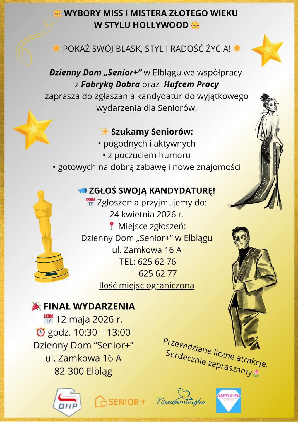 Masz w sobie blask, styl i radość życia? To wydarzenie jest właśnie dla Ciebie! Dzienny Dom „Senior+” w Elblągu zaprasza do udziału w wyjątkowym konkursie dla seniorów - pełnym elegancji, uśmiechu i dobrej zabawy.
