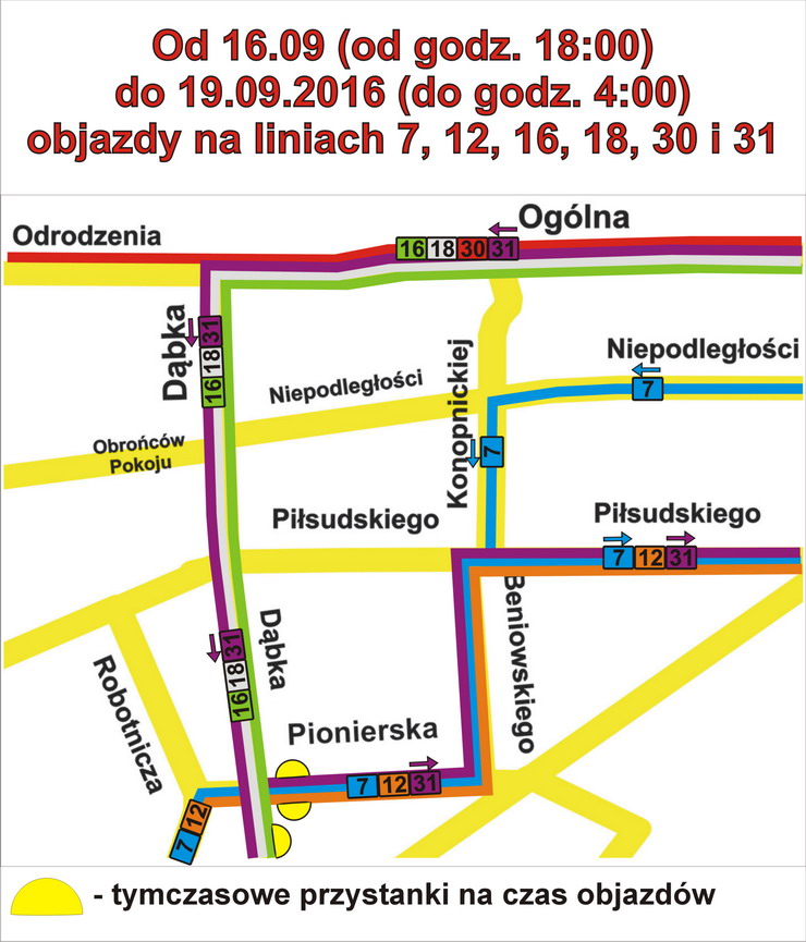 - Autobusy linii nr 16 i 18 (piątek od godz. 18:00), w obu kierunkach będą kursowały objazdem przez ul. Dąbka i Ogólną (w kierunku pętli Ogólna, od skrzyżowania Dąbka – Pionierska do skrzyżowania Dąbka-Niepodległości przystanki wyłączone z ruchu).