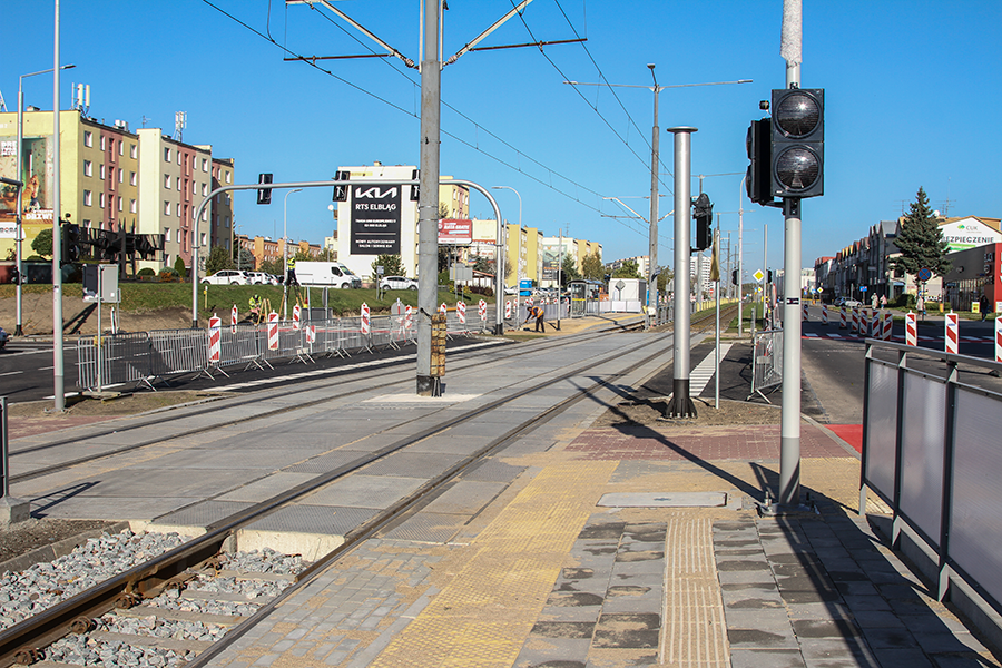 „Przebudowa torowiska tramwajowego wraz z konstrukcją i nawierzchnią drogową na skrzyżowaniu ulicy Płk. Dąbka z al. Józefa Piłsudskiego w Elblągu", jak informuje Jacek Żukowski z biura prasowego Urzędu Miasta, na dzień 17 października 2025r. w 100% wykonano: przebudowę torowiska tramwajowego wraz z konstrukcją i nawierzchnią drogową przyległą do torowiska, perony przystanków tramwajowych wraz z wyposażeniem w wiaty przystankowe i osłony przeciwbłotne, odtworzenie nawierzchni drogowej wraz z chodnikami i droga dla rowerów po robotach związanych z przebudową sieci uzbrojenia podziemnego, remont jezdni po stronie wschodniej i zachodniej skrzyżowania regulację sieci trakcyjnej, zabezpieczenie sieci kabli trakcyjnych, przebudowę elementów odwodnienia, sieci kanalizacji deszczowej, sanitarnej i wodociągowej, przebudowę i zabezpieczenie sieci i przyłączy gazowych, urządzenie zieleni drogowej, zabezpieczenie sieci elektroenergetycznych, oświetlenie uliczne, urządzenie zieleni drogowej.