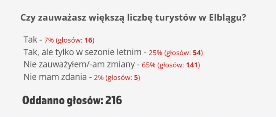 Zapytaliśmy Czytelników info.elblag.pl, czy również zauważają większą liczbę turystów w mieście. Głosowanie trwało od 21 do 23 grudnia. Udział w ankiecie wzięło 216 osób.