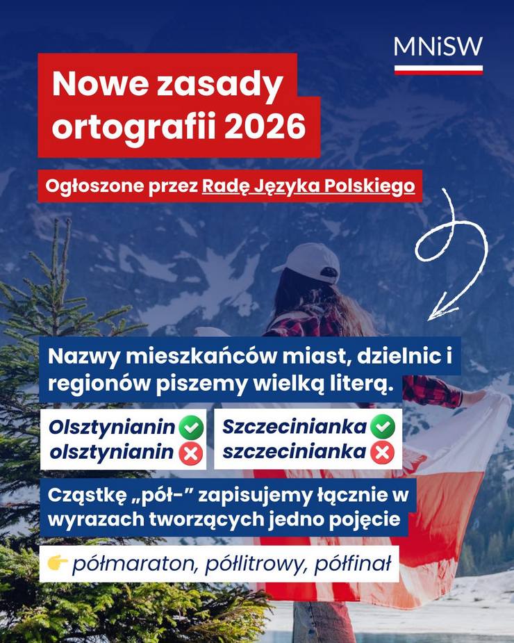 Jedna z najbardziej zauważalnych zmian dotyczy nazw mieszkańców miast, dzielnic i regionów – od 2026 r. piszemy je wielką literą, np. Szczecinianin, Warszawianka, Olsztynianin.