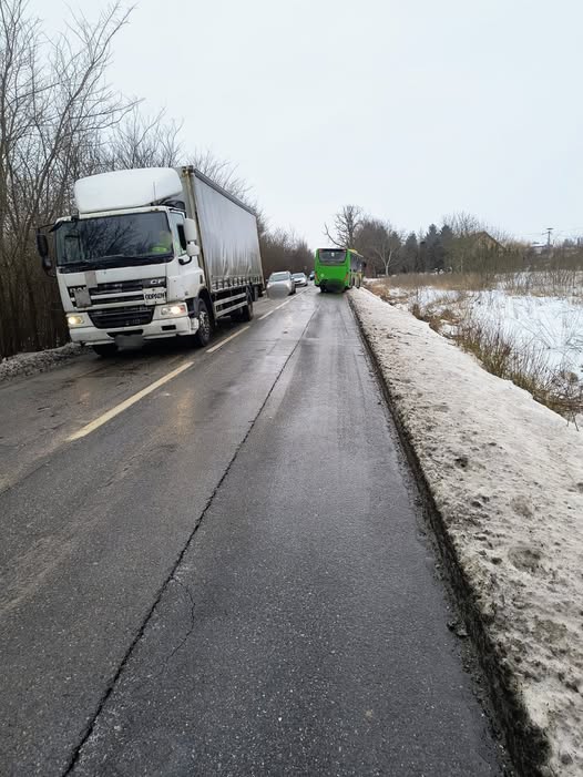 Na poboczu znajduje się autobus. który utknął z uwagi na śliską nawierzchnię.
