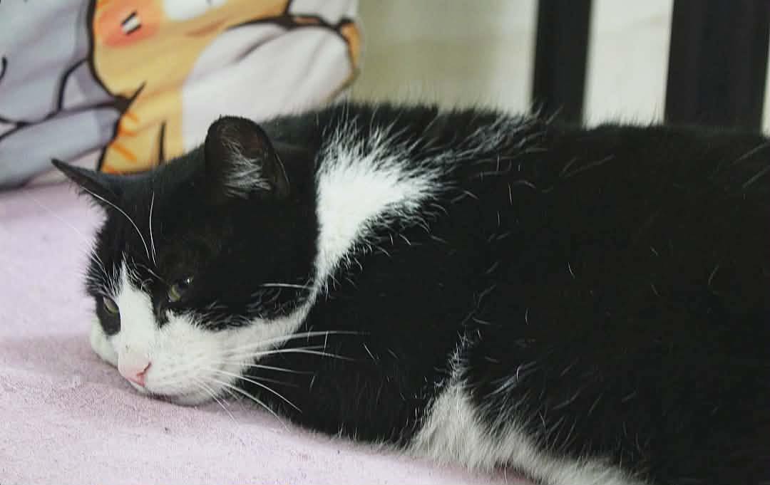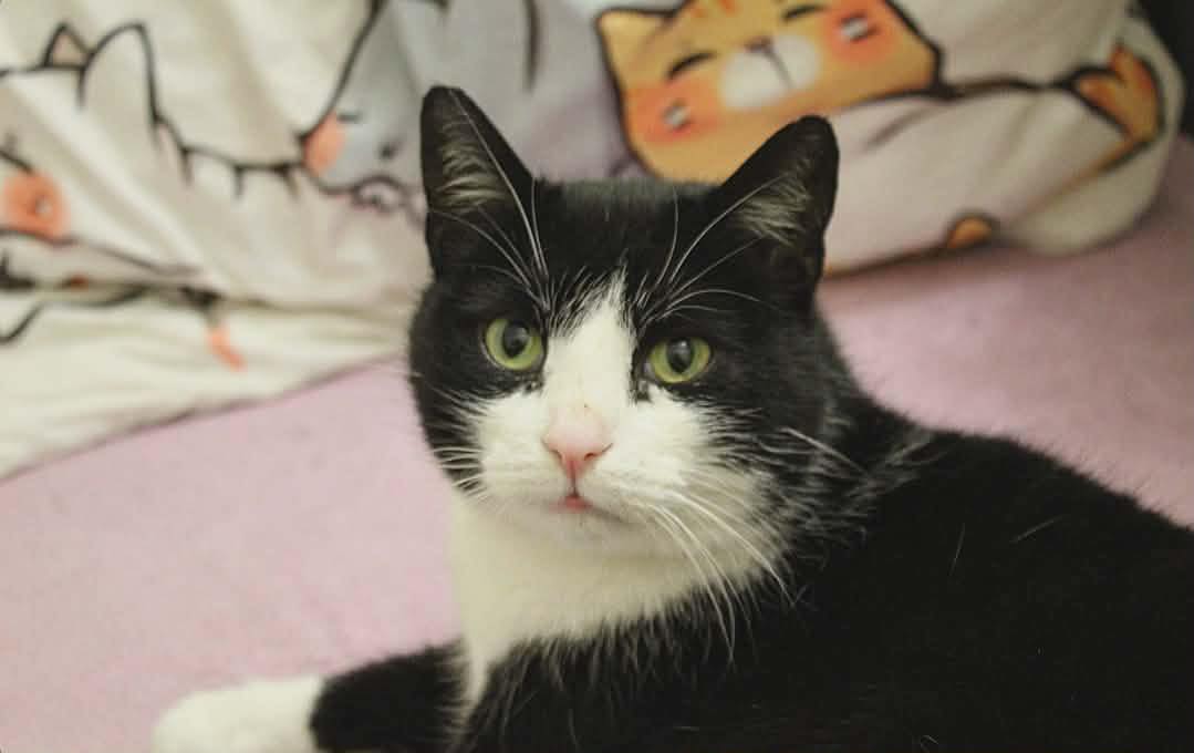 To kocurek w wieku ok. 4 lat. Akceptuje inne koty i psy, chociaż potrzebuje kilku dni, żeby przyzwyczaić się do nowych zwierzaków.