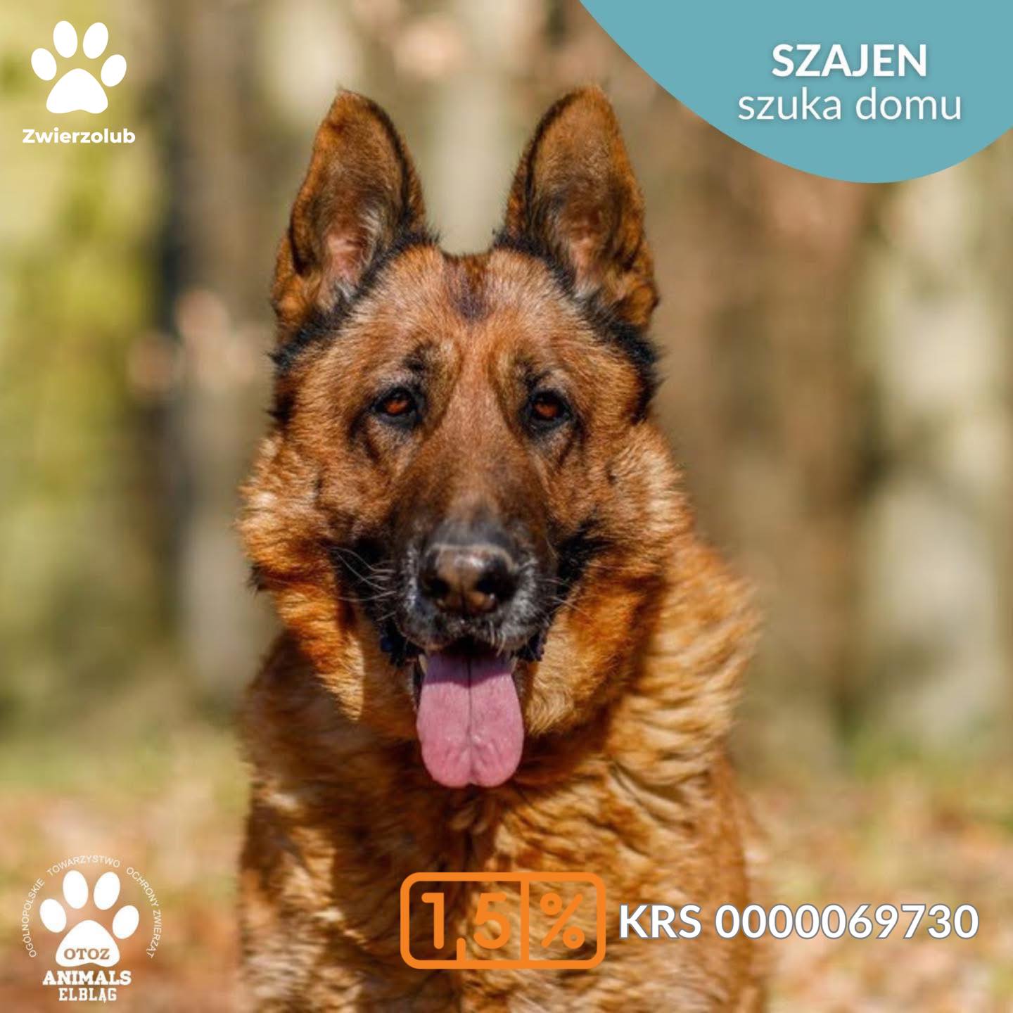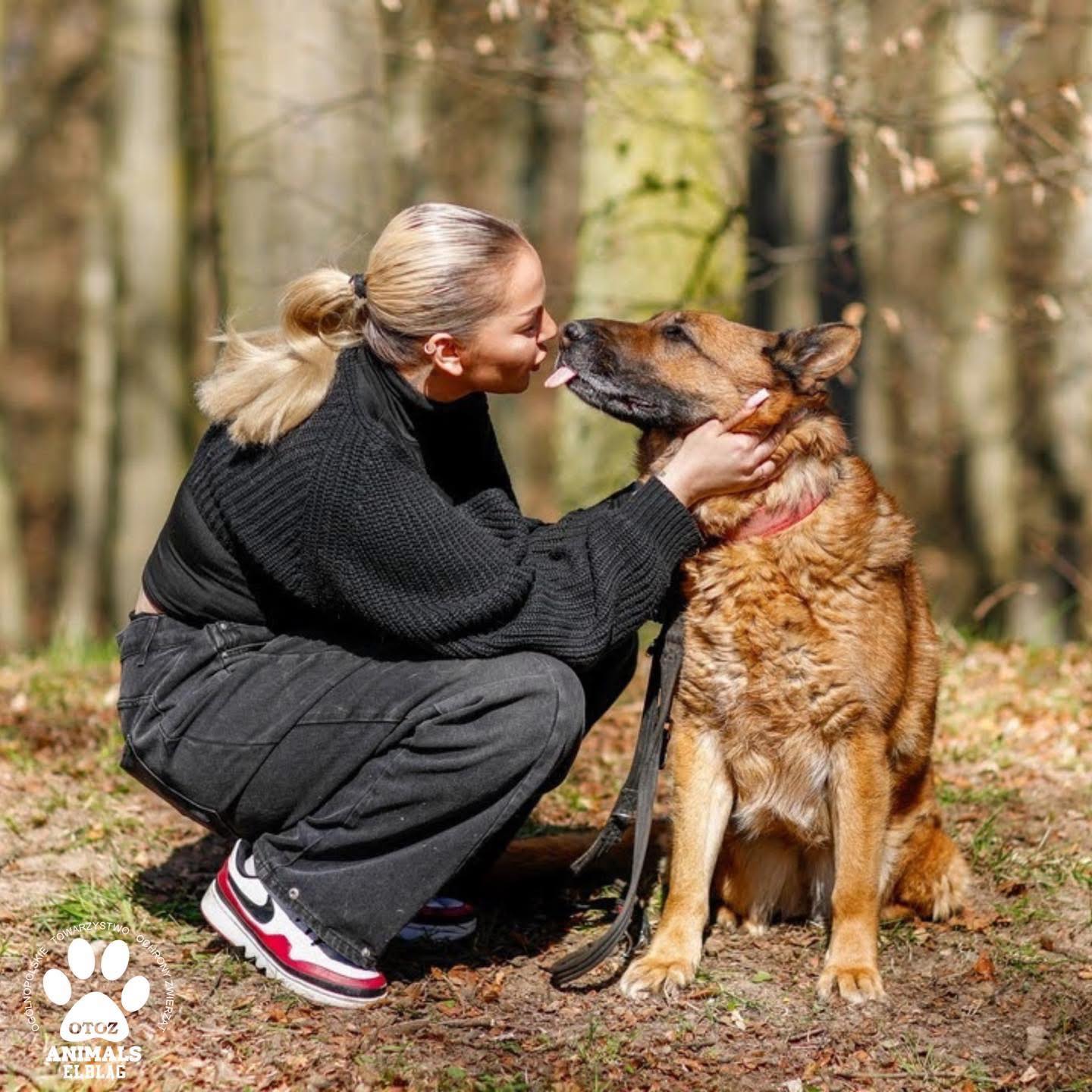 Szajen to ok. 10-letnia suczka w typie owczarka niemieckiego. Uwielbia spacery, podczas których bardzo ładnie idzie na smyczy.