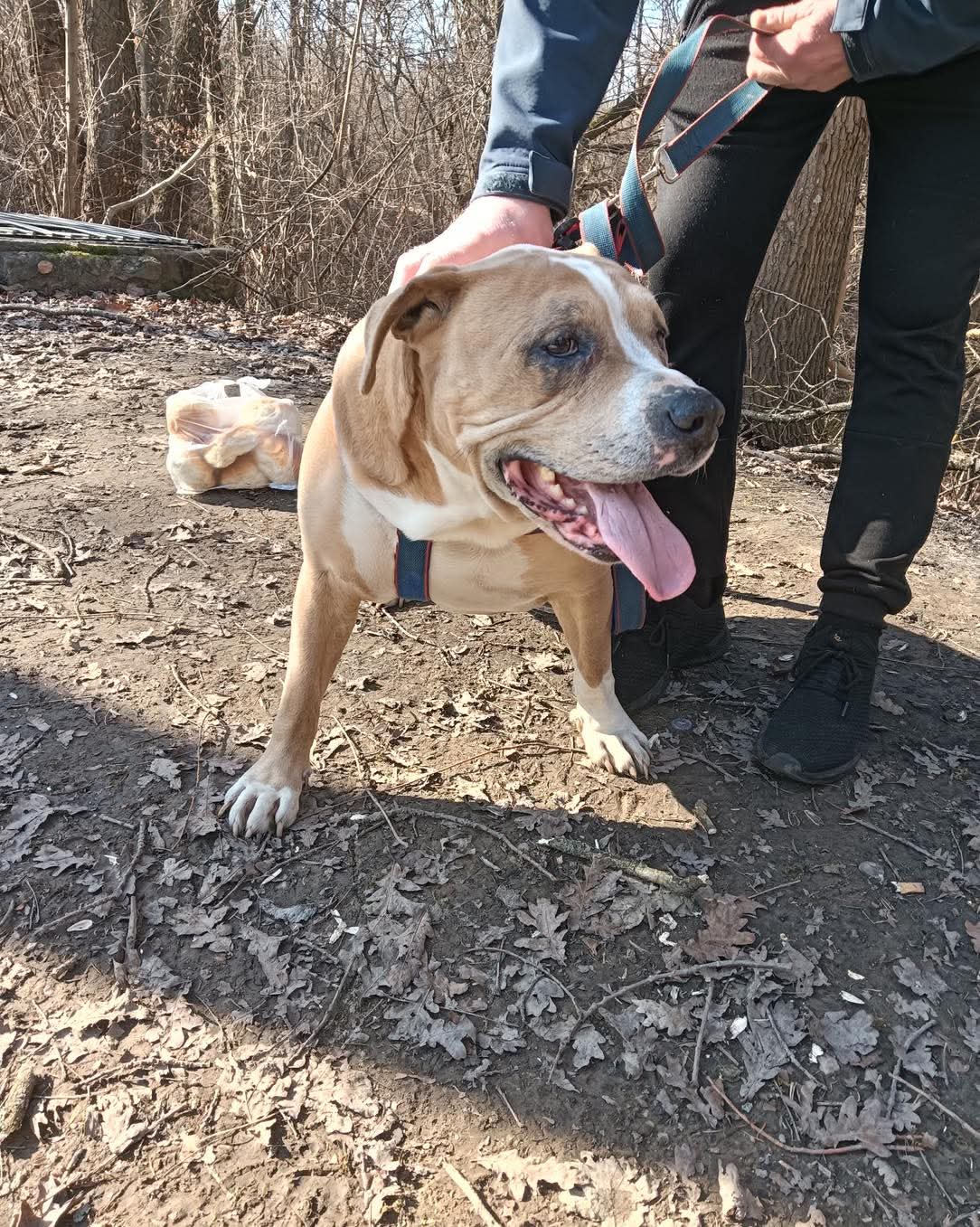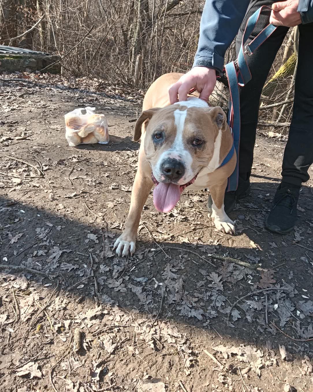 Ralf to pies w typie amstaffa w wieku około 8–10 lat. Ma piękne biszkoptowe umaszczenie i waży około 40 kg.