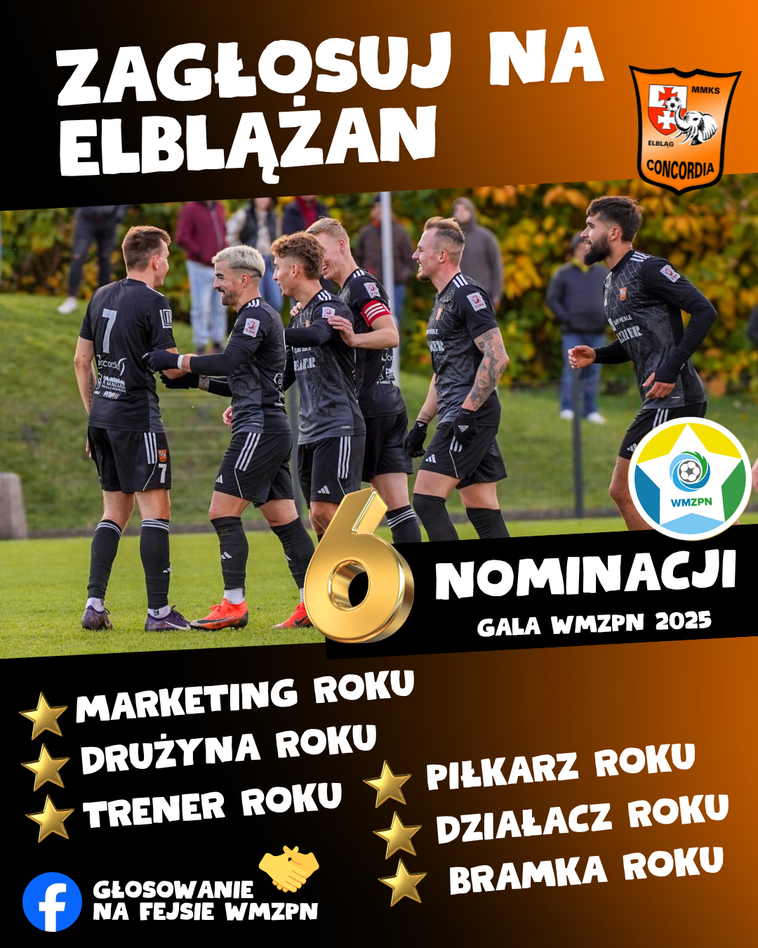 To był dobry rok dla Concordii Elbląg. Nasz klub został doceniony przez Warmińsko-Mazurski Związek Piłki Nożnej. Słoniki otrzymały 6 nominacji w piłkarskim plebiscycie za 2025 rok. Można wesprzeć elblążan głosując na Facebooku.