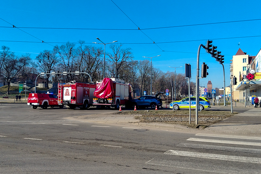 Kolizja aut osobowych z pojazdem straży pożarnej. Utrudnienia na skrzyżowaniu al. Armii Krajowej i ul. 12 Lutego