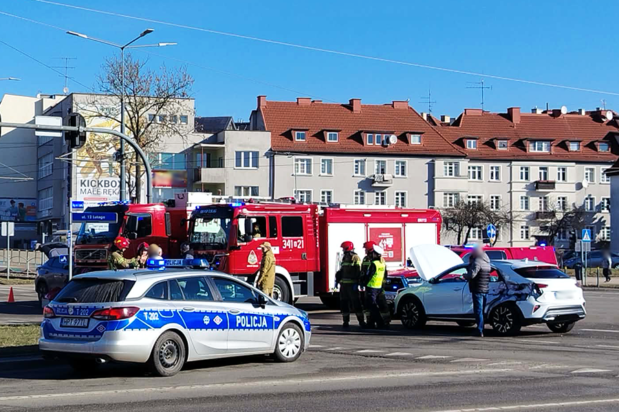 Kolizja aut osobowych z pojazdem straży pożarnej. Utrudnienia na skrzyżowaniu al. Armii Krajowej i ul. 12 Lutego